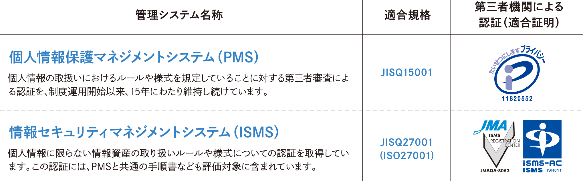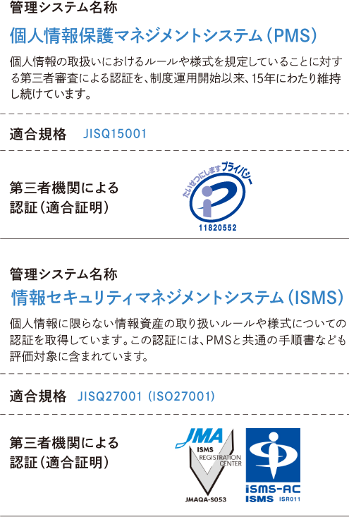 第三者機関によるプライバシーマーク認証及びISMS認証を取得。